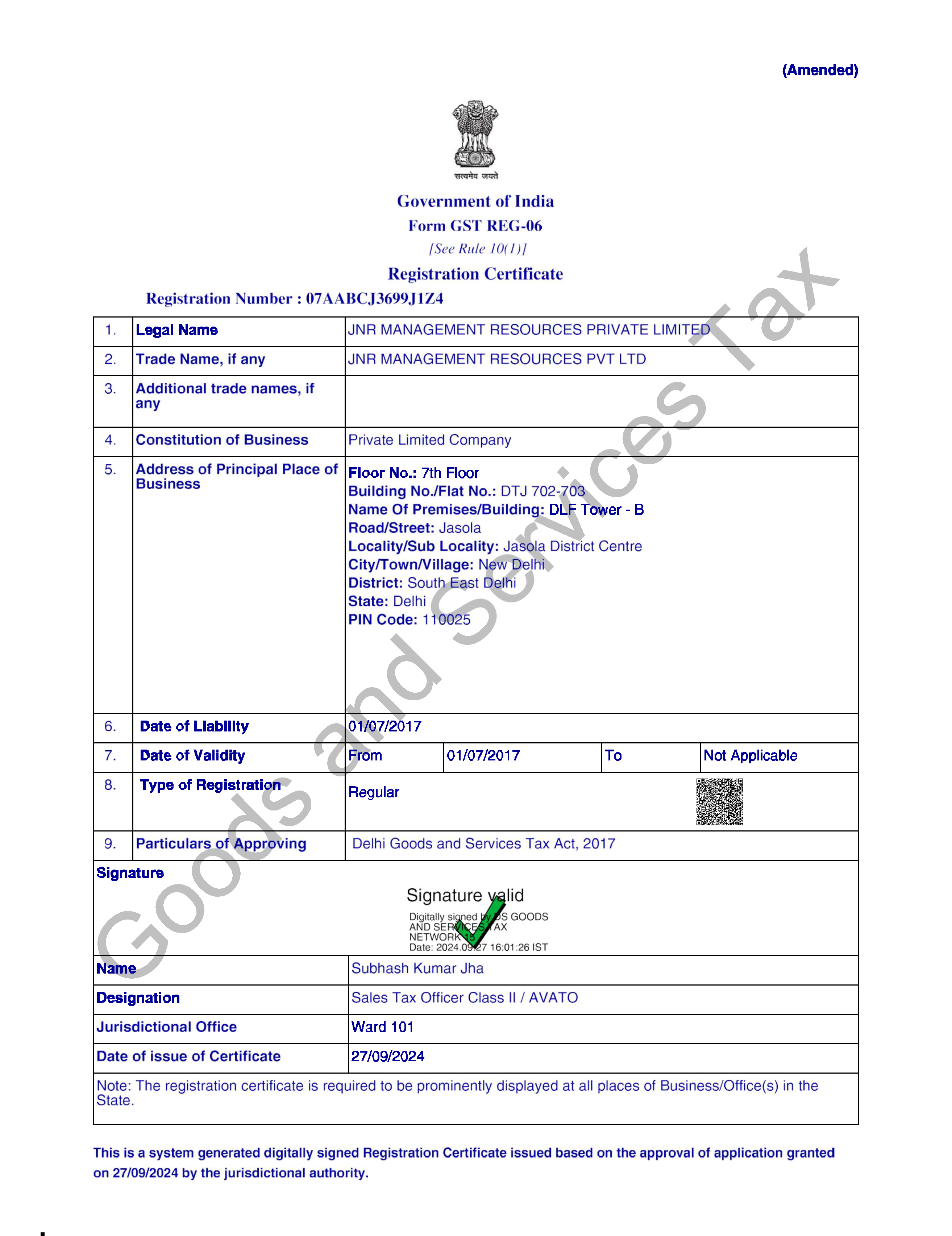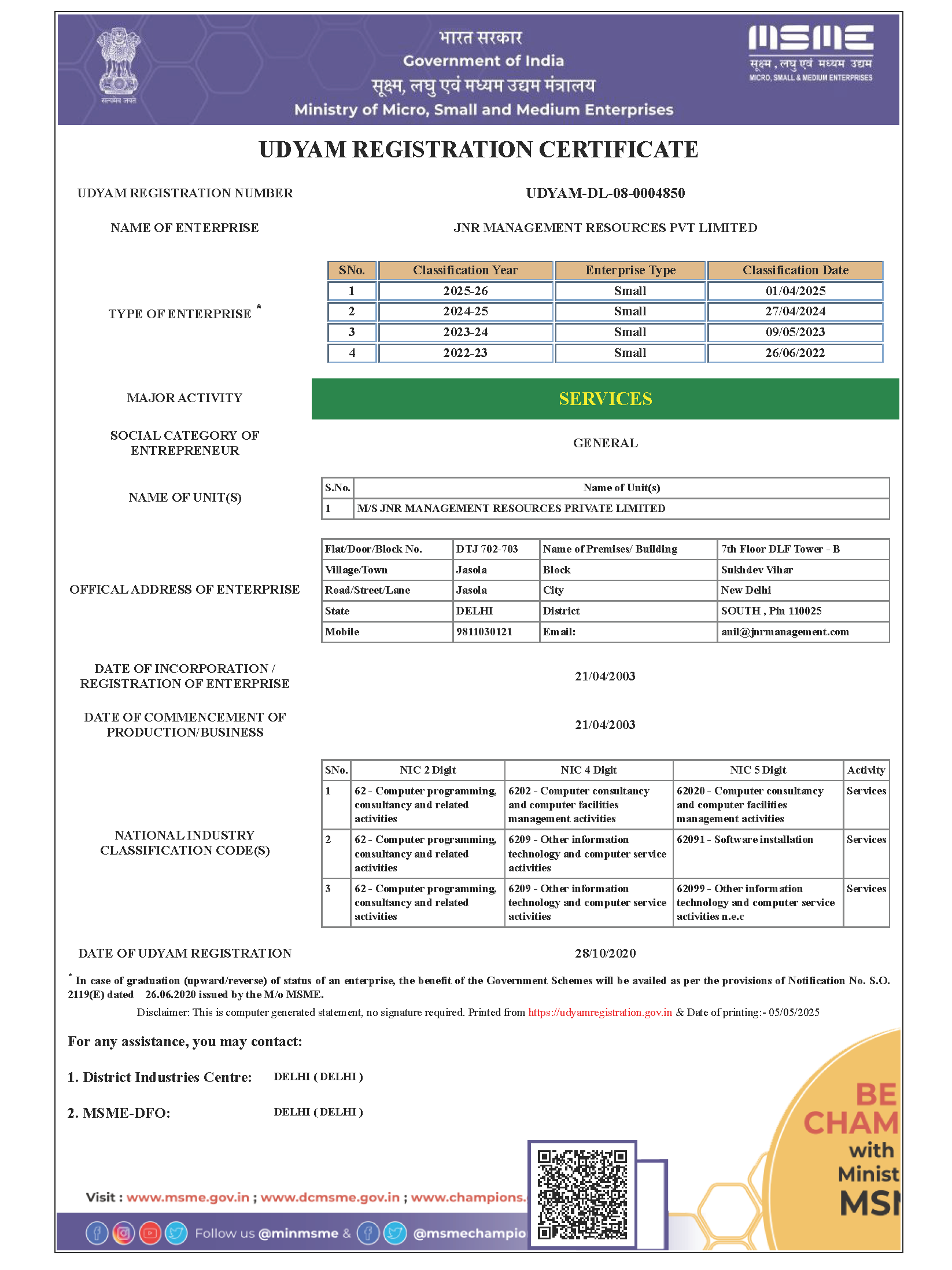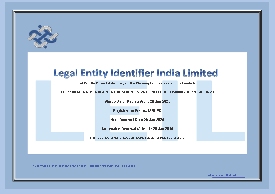 Issued on 20 January 2025; next renewal due 20 January 2026 (Automated renewal valid until 20 January 2030) JNR Management Resources Pvt. Ltd. maintains an active LEI, ensuring transparent and standardized identification across global transactions. This LEI registration supports our collaborations with banks, counterparties, and regulatory bodies by providing a unique, verifiable identity in all financial instruments and reporting frameworks.