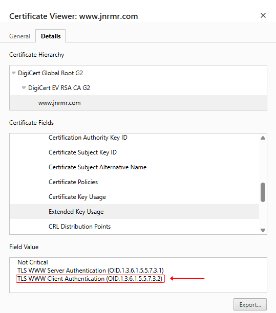 The images below show a current DigiCert EV certificate for www.jnrmr.com, which includes both server and client authentication EKUs—a configuration that will soon be non-compliant: